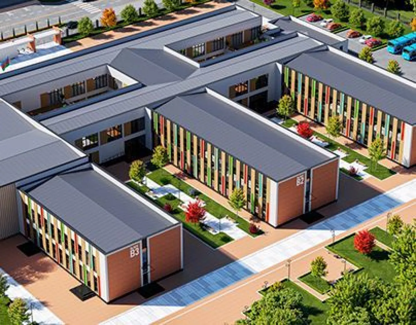 Construction of a modern educational facility including classrooms, laboratories, and sports facilities.